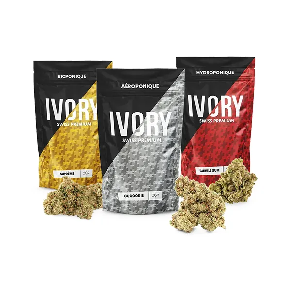 Des packs découverte permettent d'explorer plusieurs références en une commande, à prix accessible. Ivory Swiss est également la boutique vitrine du groupe Phytocann, qui compte d'autres enseignes spécialisées (Harvest Laboratoires pour les huiles, Kanolia pour les cosmétiques, Herboristerie Alexandra pour les infusions).